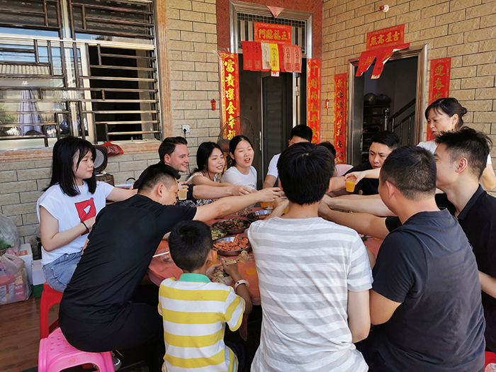 中午,我們進(jìn)住民宿。安頓好行李后,我們共進(jìn)午餐,感覺到生活的新鮮與愜意。豐盛的佳肴,濃香的美酒,讓我們沉浸在歡樂的氣氛中,享受著工作勞頓后帶來(lái)的無(wú)比快樂。舉杯,道聲辛苦了;舉杯,互致祝福。品生活芳香,享生活甘甜。團(tuán)隊(duì)人不光在工作中有拼勁,而且在酒桌上也毫不含糊,舉杯,一飲而盡。