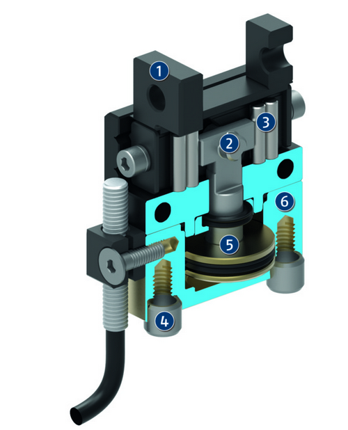 SCHUNK MPG 16產(chǎn)品結(jié)構(gòu)圖如下,活塞通過壓縮空氣上下移動。 側(cè)面鉤在活塞桿引導(dǎo)件的上端,在兩個基座爪的角槽中,從而將該運動轉(zhuǎn)變成基指的同步打開或關(guān)閉。